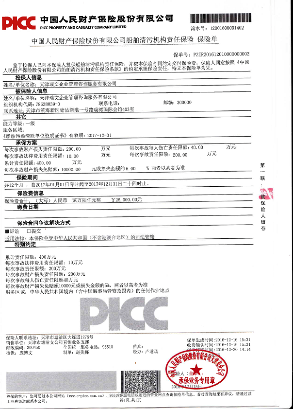 截止到2017年1月13日,ITOPF机构与天津瑞文企业管理咨询服务有限公司通过商榷,就关于防污染溢油应急相关赔付费率最终达成一致。